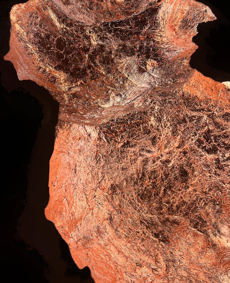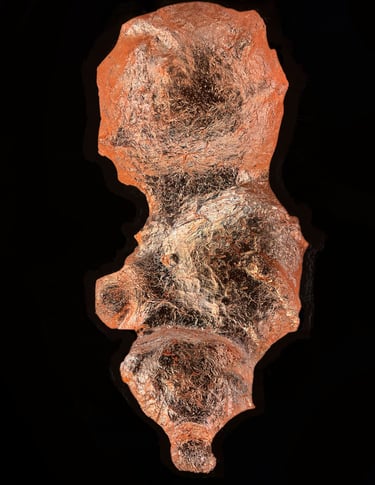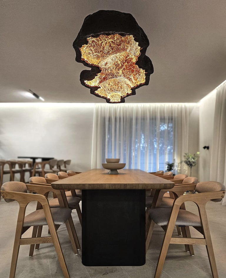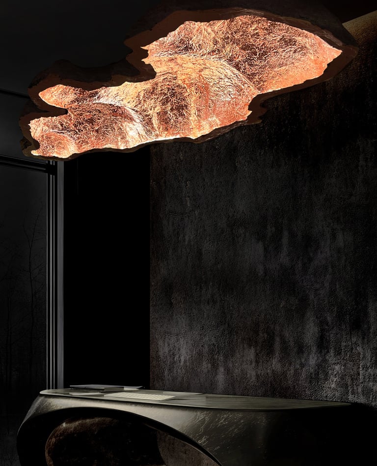 The LED modules are displaced at the base of the lamp, pointing directly into the copper leaf texture. The indirect lighting that reflects, creates a very unique effect. This ceiling pendant has a hypnotising texture due to its copper leaf finish and irregular organic shapes. Made out of recycled cellulose composite.