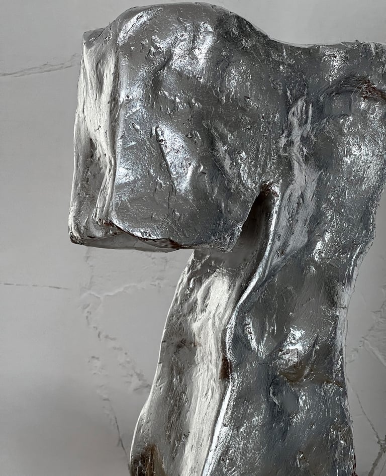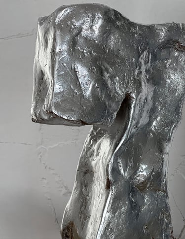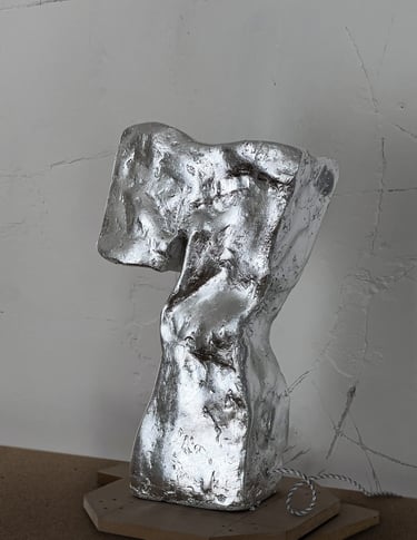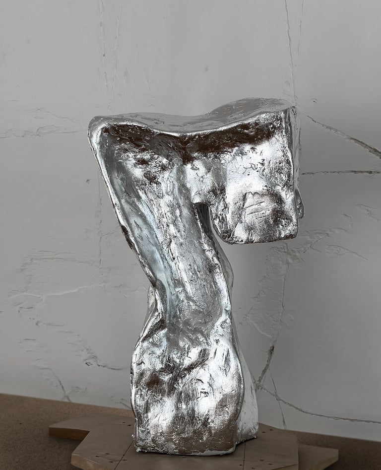 Gypsum composite, steel mesh, silver leaf, biopolymer coating.